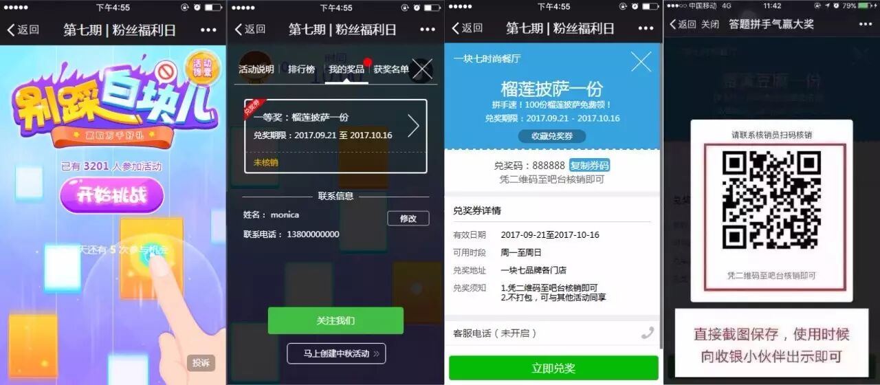 嘿,本期的粉絲福利《別踩白塊兒》, 大家踩到白塊了嗎? 據(jù)說(shuō)有小伙伴只花了幾十秒, 就輕松獲獎(jiǎng) 厲害了,這手速,這智商! 活動(dòng)結(jié)束,公布本期福利中獎(jiǎng)名單啦 (點(diǎn)擊圖片放大) ▼ 恭喜你們獲得小七提供的 “榴蓮披薩”一份! 味濃,香味四溢,層次豐富,入口嫩滑細(xì)致, ▼ 請(qǐng)中獎(jiǎng)的幸運(yùn)兒,趕緊領(lǐng)走喔~ 獎(jiǎng)品有效期:9月21-10月16日 憑游戲內(nèi)的中獎(jiǎng)二維碼至吧臺(tái)核銷即可 不打包,可與其他活動(dòng)同享喔 逾期不候喲 沒(méi)有中獎(jiǎng)的親也不要心碎 每個(gè)月17日,我們不見(jiàn)不散 領(lǐng)券后如何使用? (點(diǎn)擊放大圖片) 領(lǐng)取后,優(yōu)惠券在您游戲界面的卡包里, 打開(kāi)卡包內(nèi)的優(yōu)惠券有效期內(nèi)用餐至吧臺(tái)兌換即可 往期福利活動(dòng)的中獎(jiǎng)名單 常熟直營(yíng)門店 里顏港店 地址:蘇州常熟市虞山鎮(zhèn)里顏港8號(hào)(農(nóng)工商超市對(duì)面) 電話:0512—52775517 萬(wàn)達(dá)廣場(chǎng)店 地址:珠海路8號(hào)萬(wàn)達(dá)廣場(chǎng)4樓 電話:0512—52028677 昆山直營(yíng)門店 春暉店 地址:昆山市春暉路白塔老街5號(hào)(龍皇廟對(duì)面) 電話:0512—57173777 超華店 地址:昆山市白馬涇路超華廣場(chǎng)4樓 電話:0512—57701177 世茂店 地址:昆山市前進(jìn)東路199號(hào)綜合樓3樓 電話:0512—57037770 九方城 地址:蕭林路紫竹林路口(九方城五樓) 電話:0512—57536177 中茵店 地址:前進(jìn)西路中茵世貿(mào)廣場(chǎng)負(fù)一樓 電話:0512—55232177 萬(wàn)達(dá)廣場(chǎng)店 地址:青陽(yáng)北路238號(hào)萬(wàn)達(dá)廣場(chǎng)3樓 電話:0512—57557717 蘇州直營(yíng)門店 西城永捷店 地址:蘇州市廣濟(jì)南路19號(hào)西城永捷4F 聯(lián)系電話:0512—68322177 久光百貨店 地址:蘇州市工業(yè)園區(qū)旺墩路268號(hào)久光百貨4樓藍(lán)區(qū) 聯(lián)系電話:0512-68788977 太倉(cāng)直營(yíng)門店 南洋廣場(chǎng)店 地址:人民南路96號(hào)南洋廣場(chǎng)(小吃一條街) 電話:0512—53991777 萬(wàn)達(dá)廣場(chǎng)店: 地址: 萬(wàn)達(dá)廣場(chǎng)3樓 萬(wàn)達(dá)影城旁 電話:0512-53731777 張家港直營(yíng)門店 吾悅廣場(chǎng)店 地址:張家港市吳悅廣場(chǎng)四樓(暨陽(yáng)湖公園對(duì)面) 電話:0512—56885177 楊舍老街店 地址:張家港楊舍老街5棟87號(hào)(戲臺(tái)旁) 聯(lián)系電話:0512—56367977《第七期 | 一塊七9月17日粉絲福利日》