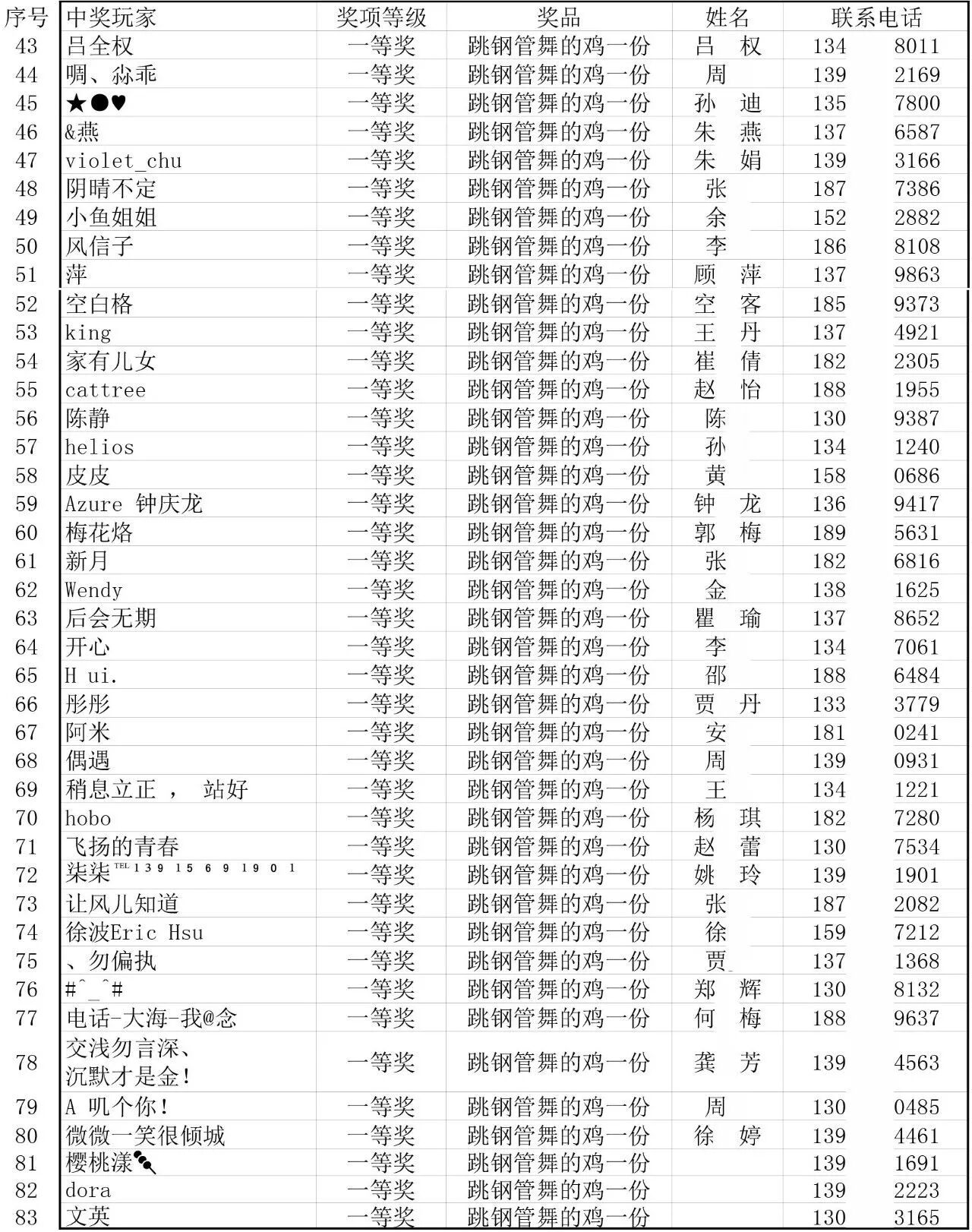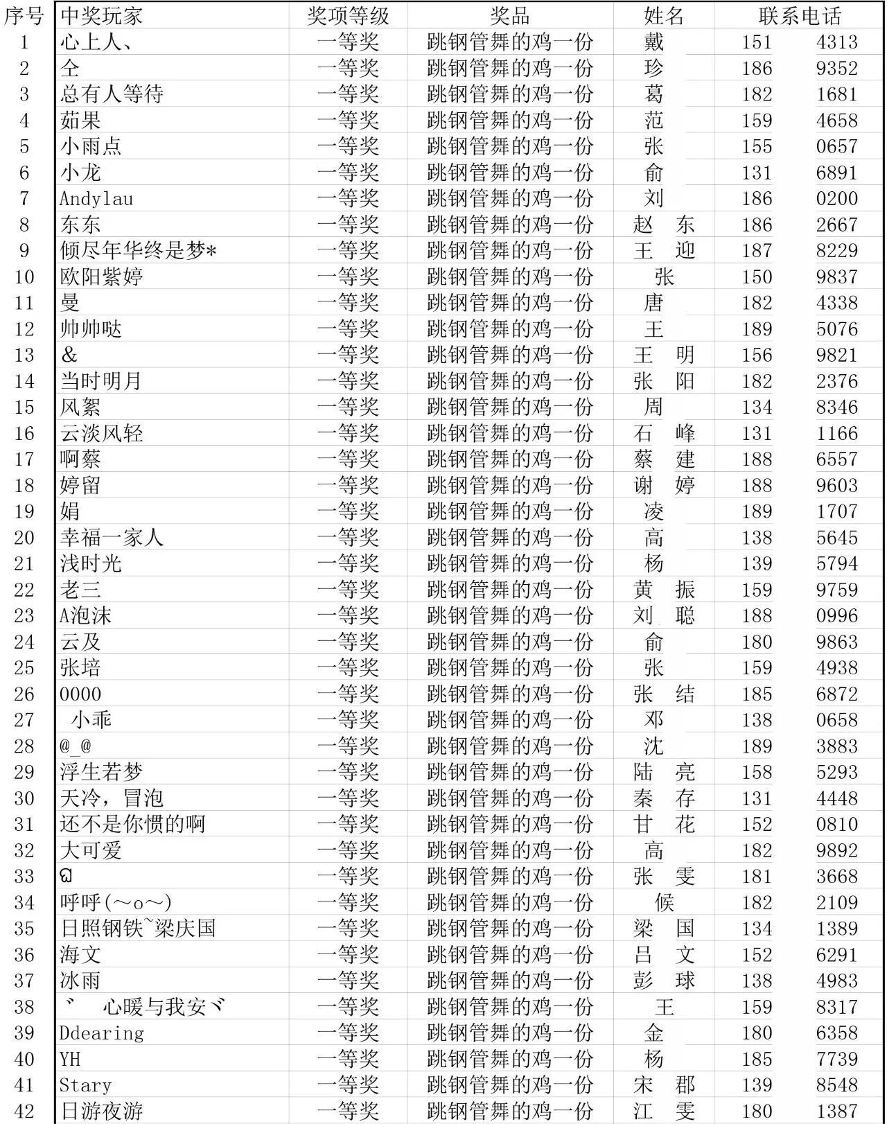 嘿,本期的粉絲福利 活動結(jié)束,公布中獎名單啦 (點擊圖片放大) 恭喜以上中獎粉絲獲得小七提供的 “跳鋼管舞的雞”一份! 請中獎的幸運兒,趕緊領(lǐng)走喔~ 跳鋼管舞的雞 一天一夜腌制,經(jīng)2小時爐火歷練,只為舞姿銷魂。 獎品有效期:10月20-11月16日 憑游戲內(nèi)的中獎二維碼至吧臺核銷 或直接報手機號碼 不打包,可與其他活動同享喔 沒有中獎的親也不要心碎 每個月17日,我們不見不散 往期福利活動的中獎名單 領(lǐng)取后,優(yōu)惠券在您游戲界面的“我的獎品”卡包里, 打開卡包內(nèi)的優(yōu)惠券有效期內(nèi)用餐至吧臺兌換即可 點擊圖片放大查看 更多菜品推薦 ▽ 咱家的魚頭 | 老字號臭豆腐 | 榴蓮薄餅 | 跳鋼管舞的雞 | 招牌蒜香水晶蝦 | 《第七期 | 一塊七9月17日粉絲福利日》